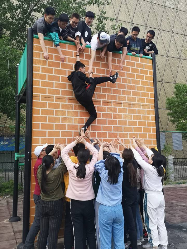 过程中,学员们被分成两个小组,协作完成多项户外素拓活动。在团队风采展示环节,各队自主设计队旗与口号,展现了学员们的蓬勃朝气;在穿越“电网”环节,队员们团结协作,合力制定最优方案,展现了其睿智灵活的应变能力;在突破自我的“攀岩”和“断桥”环节,队员们克服恐高等多种障碍,努力挑战自我;在最后的“翻越毕业墙”环节,全部成员拧成一股绳,全力以赴、拼搏到底,最终完成了目标,取得了胜利。