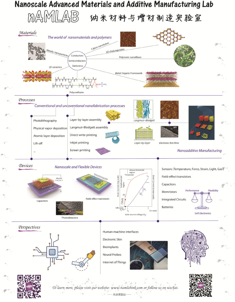 朱剑教授的团队(纳米级先进材料与增材制造实验室,nAMLAB)致力于研究新型非硅电子、光电子器件及柔电器件的研究。课题组主要从事纳米材料的合成和大面积组装,探索纳米材料在低成本、高性能、柔性/可拉伸电子和光电子领域的应用,这些研究工作有望在人工智能、医疗保健、生物植入、人机界面和物联网等领域发挥重要作用。研究内容包括:1. 纳米半导体材料. 利用溶液法进行大量制备、组装二维材料,并应用于逻辑电路、光电探测和类脑计算方面的研究;2. 柔性导体材料. 通过设计导体材料的单分散性和可扩展性,组装网络和优化界面来增强宏观材料的化学和物理性质,追求高精度、优异机械弹性及高电导互连的可变形微电子系统,满足开发高度集成的人机交互可穿戴和可修复电子光子皮肤的巨大需求;3. 微型与柔性能源器件. 研究可拓展、低成本高性能的柔性电池技术,探索可持续发展清洁能源转换与存储体系,将其应用于健康监护、柔性电子、应变传感、可植入器件等领域,解决全球能源需求迅速增长及环境问题。