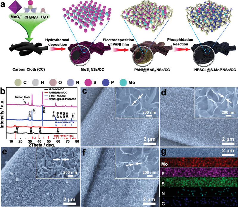 A robust polyaniline-assisted strategy is developed to construct a self-supported electrode constituting a nitrogen, phosphorus, sulfur tri-doped thin graphitic carbon layer encapsulated sulfur-doped molybdenum phosphide nanosheet array (NPSCL@S-MoP NSs/CC) with accessible nanopores, desirable chemical compositions, and stable composite structure for efficient hydrogen evolution reaction (HER). The multiple electronic coupling effects of S-MoP with N, P, S tri-dopants afford effective regulation on their electrocatalytic performance by endowing abundant accessible active sites, outstanding charge-transfer property, and d-band center downshift with a thermodynamically favorable hydrogen adsorption free energy (Delta G(H*)) for efficient hydrogen evolution catalysis. As a result, the NPSCL@S-MoP NSs/CC electrode exhibits overpotentials as low as 65, 114, and 49 mV at a geometric current density of 10 mA cm(-2) and small Tafel slopes of 49.5, 69.3, and 53.8 mV dec(-1) in 0.5 m H2SO4, 1.0 m PBS, and 1.0 m KOH, respectively, which could maintain 50 h of stable performance, almost outperforming all MoP-based catalysts reported so far. This study provides a valuable methodology to produce interacted multi-heteroatomic doped graphitic carbon-transition metal phosphide electrocatalysts with superior HER performance in a wide pH range.